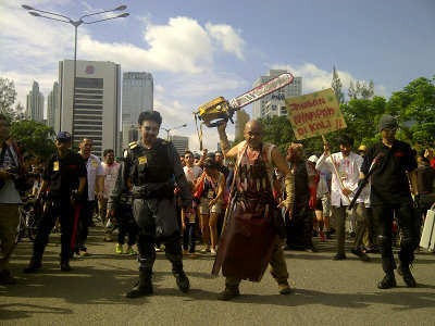 Jakarta - Ratusan orang berkostum ala mayat hidup alias zombie berkumpul pagi ini di Jalan MH Thamrin, Jakarta Pusat. Mereka mengenakan pakaian layaknya zombie dalam film.