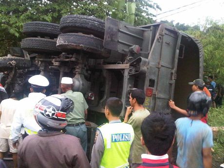 Bogor, - Truk TNI yang mengangkut puluhan murid Madrasah Aliyah An-Najah, Jakarta Selatan, terguling di tanjakan Selarong, Desa Cipayung, Kecamatan Megamendung, Bogor. Satu penumpang masih terjebak dalam ruang kemudi.