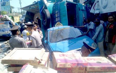 Semarang - Akibat rem yang blong, sebuah truk pembawa keramik sehingga menabrak sejumlah kendaraan dan akhirnya terguling di Semarang. Seorang penjual koran tewas tertindih truk.