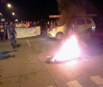 Aksi unjuk rasa dilakukan sekitar pukul 00.00 WIB, Rabu (11/12/2013). Mereka membentangkan spanduk yang bertuliskan 'Konsolidasi Mahasiswa Nasional Indonesia (Komando)'.
