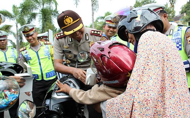 "Kita biasanya memberikan surat tilang bagi pelanggar, sekali-kali ganti kita berikan hadiah kepada warga yang tertib," jelasnya.